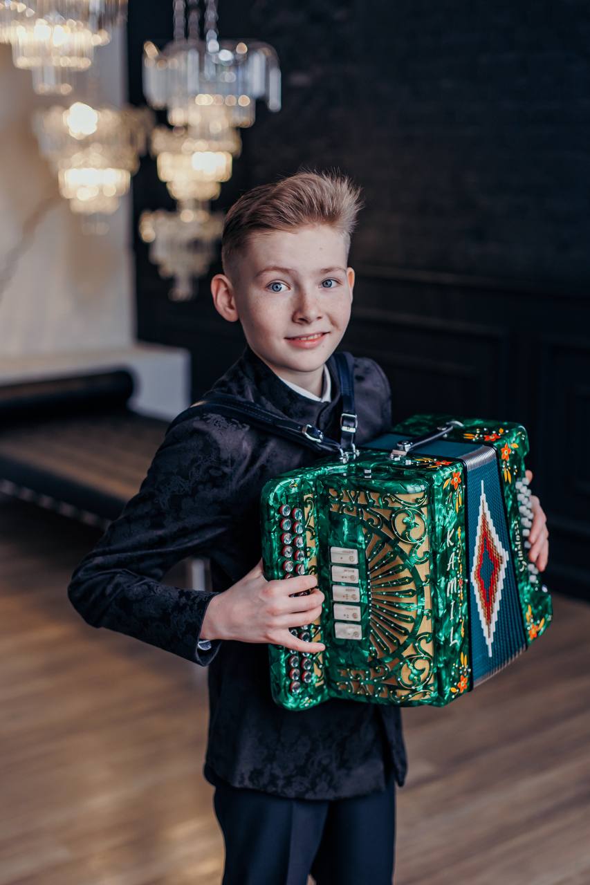 – Тальяннар белән дә мавыга башлады, яратып өйрәнә. Баланың кызыксынуы булгач, туган көненә Сваровски ташлары белән исеме язылган, пыяла клавишалы тагын бер яңа баянга заказ бирдек. Анысы ярты машина бәясе «генә» – 800 мең сумга төште. Тавышы искиткеч! Кечкенә гармуннар белән кызыксына башлады. Аларын да алдык. Камилнең бүлмәсендә киштәләрдә дә, идәндә дә тезелешеп торалар. Төрлесе төрле тональлек, төрле әсәр өчен кирәк. Баланың үсешен күргәч, көчебездән килгәнчә бөтен кирәген алабыз инде. Исемле баянын аеруча нык ярата, бөтен җиргә шуны йөртә.