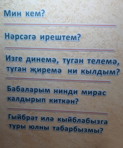 Рәсемдә: Балтач үзәк мәчете музеендагы гап-гади колоннага ике яклап язылган шушы фикерләр беркемне битараф калдырмады. «Килгән кунакларның һәркайсы аларны төшереп алып китә, инде «Мин кем?» дип башланганын Казаныбызда да күрергә мөмкин», – ди музей җитәкчесе Айгөл ханым. Шигарьләр белән генә мавыкмыйлар, бу – аларның эш девизы да.