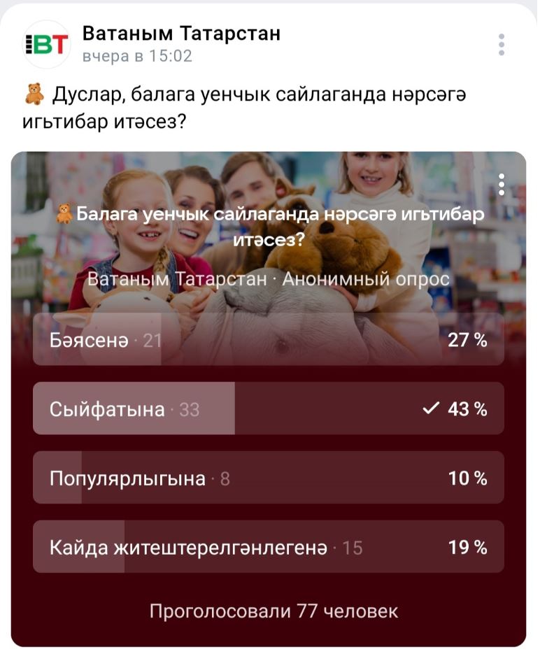 Илкүләм халык фикерен өйрәнү үзәге (ВЦИОМ) белгечләре уздырган тикшеренү нәтиҗәләренә ышансаң, ата-аналарның күбесе (60 проценты), уенчык сайлаганда, иң беренче чиратта, баласының нәрсә яратуына игътибар итә икән. Респондентларның 57 процентына – уенчыкның куркынычсыз булуы, 32 процентына бәясе мөһим. Бу уңайдан газетабызның социаль челтәрдәге сәхифәсендә дә сораштыру уздырдык. Анда да фикерләр аерыла.