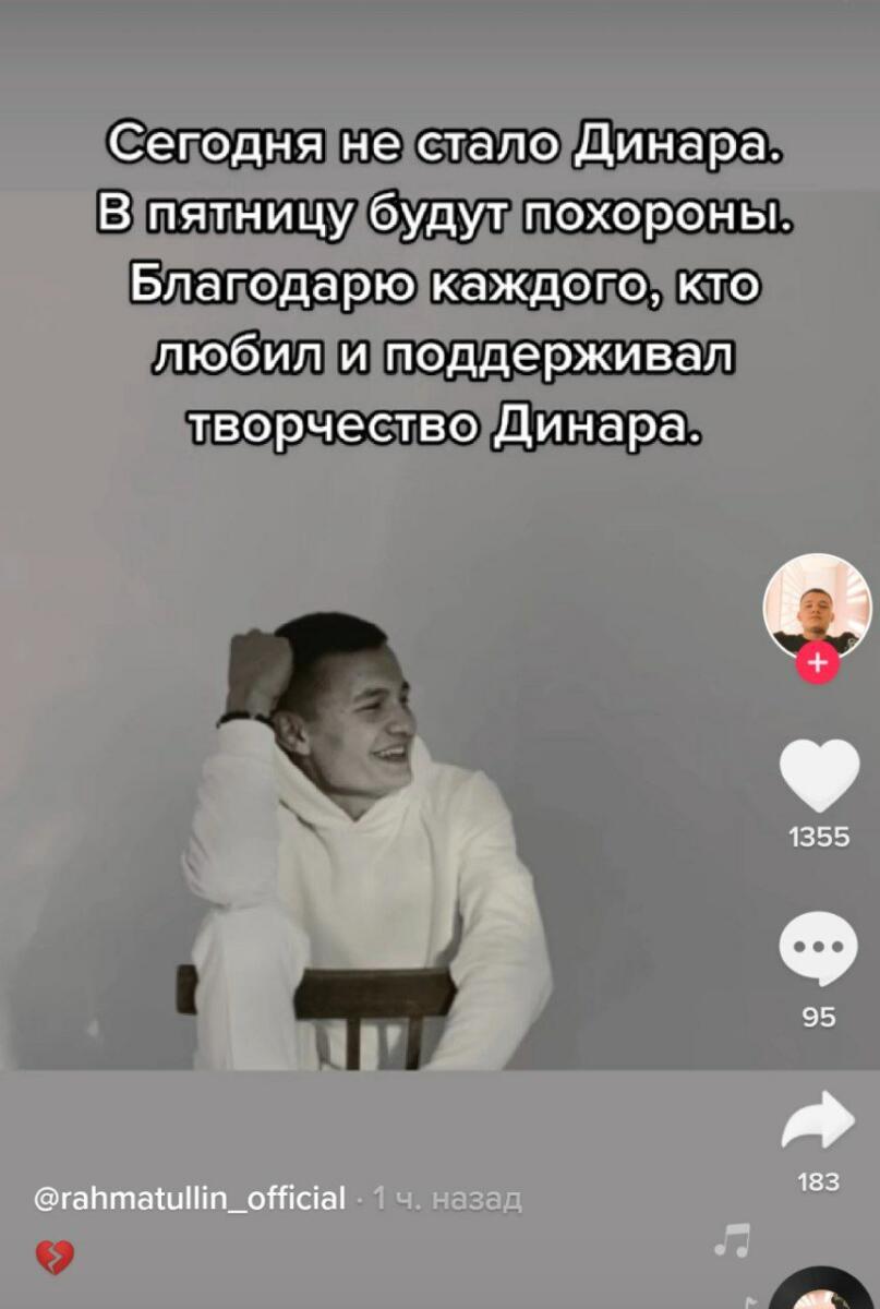 Татарстанда туып үскән яшь җырчы Динар Рахматуллин вафат. Бу хакта җырчының шәхси аккаунты аша туганнары хәбәр итте.