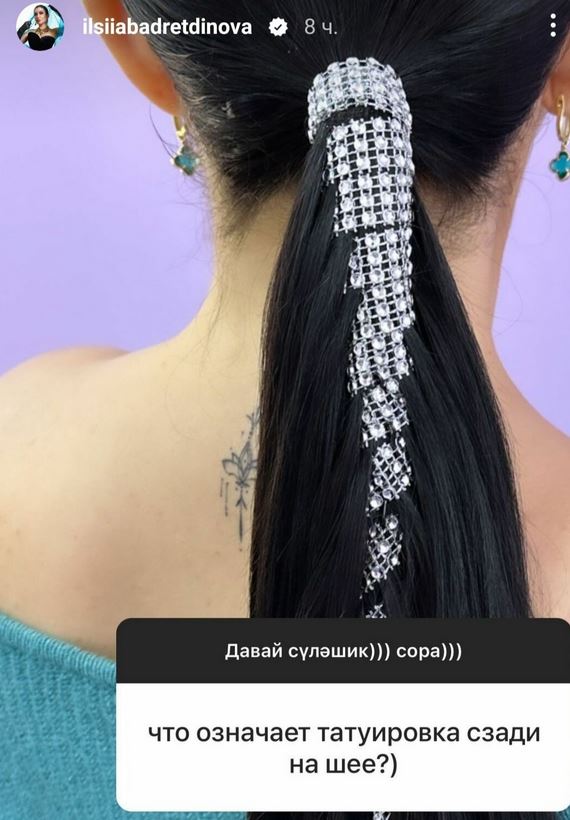 Илсөя Бәдретдинова социаль челтәрендә татуировкасын күрсәткән. Ул аның муенының арткы өлешендә урнашкан.