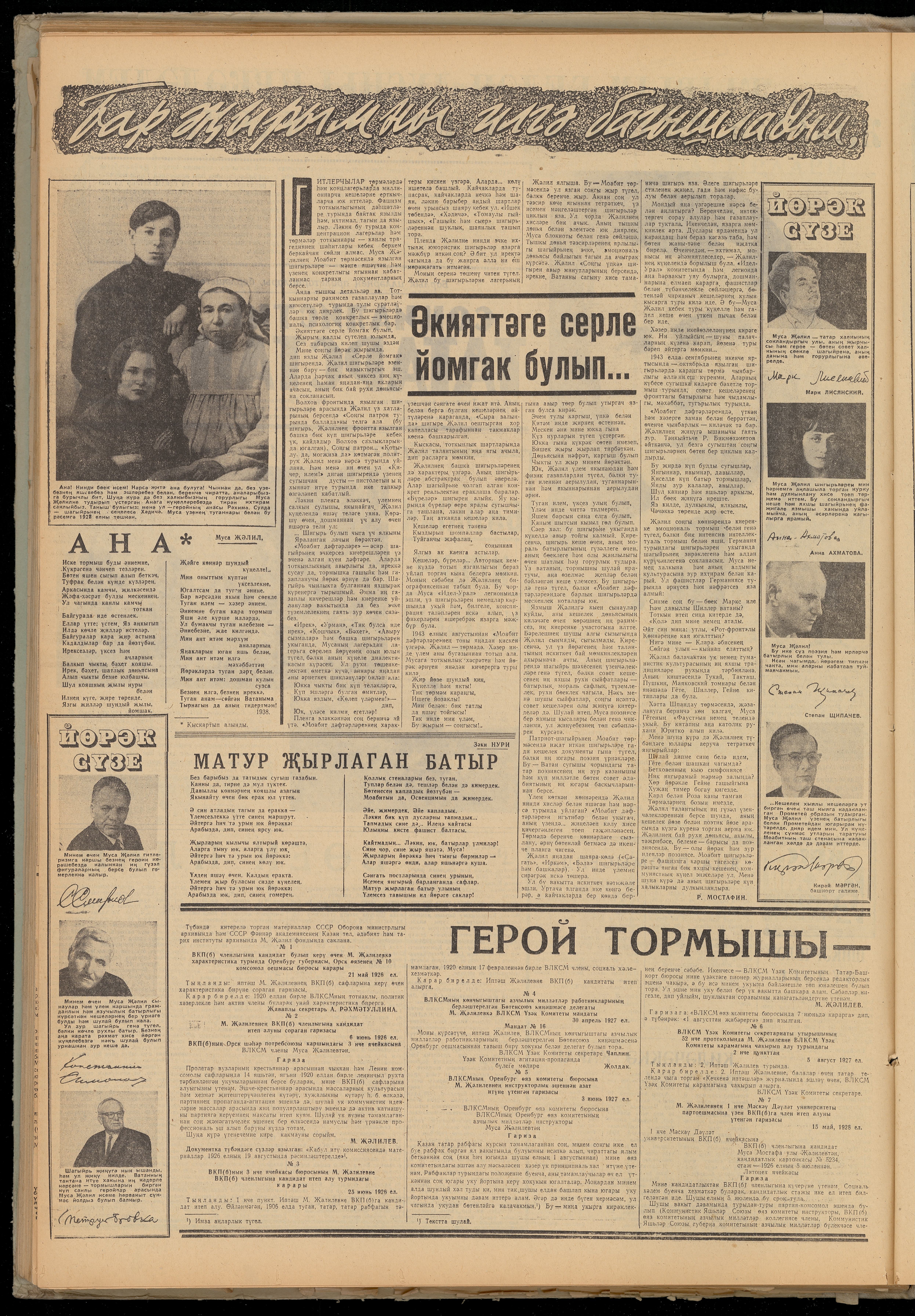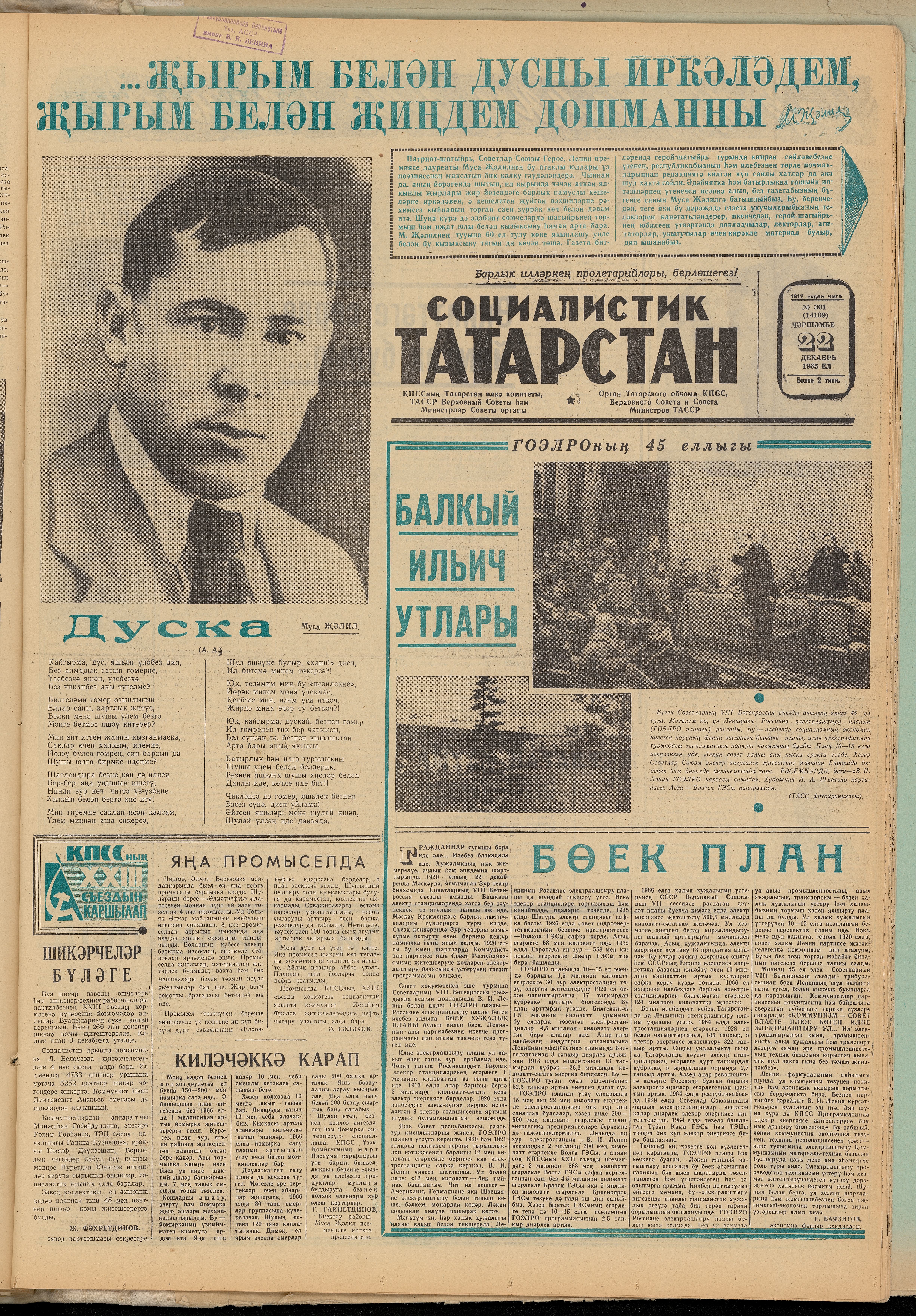 Каһарман-шагыйрь Муса Җәлилгә бәйле истәлекләрне барлауны дәвам итәбез. Бу юлы архивтан «Социалистик Татарстан» (хәзерге «Ватаным Татарстан») газетасының 1965 ел, 22 декабрь санын табып алдык. Муса Җәлилнең тууына 60 ел тулу көненә якынлашканда чыккан әлеге сан тулысынча шагыйрьгә багышлана.
