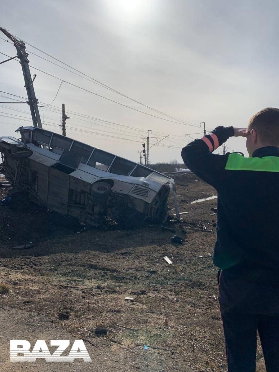 Baza телеграм-каналы мәгълүматлары буенча, автобус поезд юлы өстендә ватылып калган һәм күченү узарга өлгермәгән.