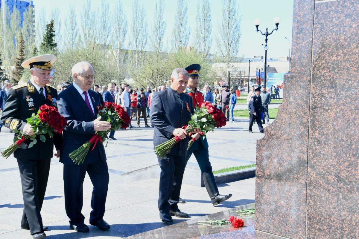Бүген Татарстан Президенты Рөстәм Миңнеханов Казанның Җиңү паркындагы Мәңгелек утка чәчәкләр салды.