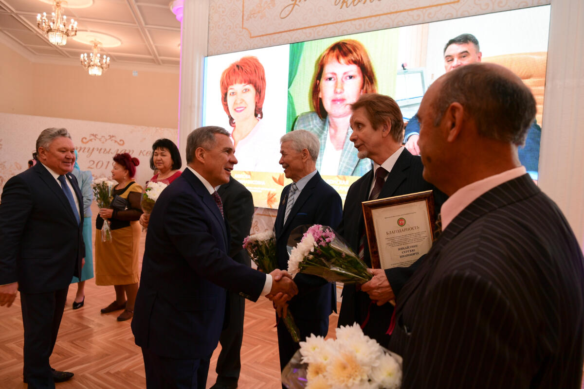Президент укытучыларның республиканың социаль-икътисади үсешенә дә саллы өлешен кертүен әйтте.“Ворлдскиллс” чемпонатындагы уңышлары өчен дә мөгаллимнәргә рәхмәтен белдерде. Татарстан укучыларының берничә ел рәттән олимпиада нәтижәләре буенча илдә беренче өчлеккә керүен билгеләп узды.