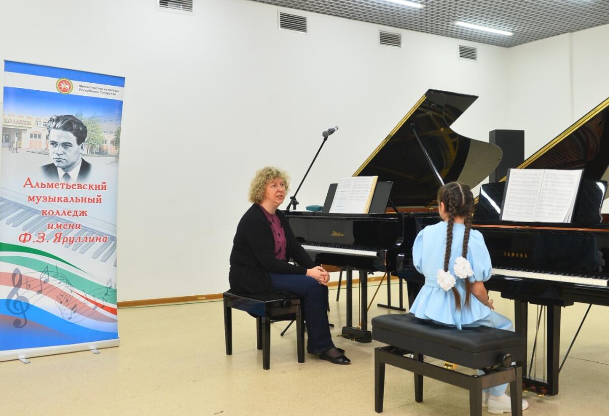 Проект кысасындагы мастер-классларның барысы да Әлмәт музыка көллиятендә узды. Без килеп кергәндә, уку йорты музыка дөньясына чумган иде. Музыка көллияте булгач, исеме җисеменә туры киләдер инде, диярсез. Ләкин ул көнне биредә аеруча илаһи мохит хөкем сөрде: Россиянең атказанган укытучысы, Мәскәү консерваториясе профессоры Мирослава Марченко музыка әсәрләренең иң нечкә урыннары, серләре турында сөйләде.