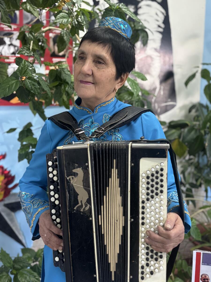 – Гаиләдә 4 кыз үстек. Әти безне утыртып, кулга гармун тоттырган. Мин шунда үземчә уйнап киткәнмен. 55 ел инде гармунның кулдан төшкәне юк, – ди ул. – Гел сәхнәдә без. Концертлар белән төрле җирләргә барабыз. Музыкаль белемем юк, гомер буе станокта эшләдем. Җырлап яшәү рәхәт! Шундый сәләт белән туганмын бит.
